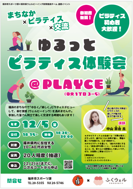 12/5(金)、FUKUMACHI BLOCK内「PLAYCE」にて、福井県ウェルビーイング政策推進チームと連携した 初心者向けピラティスイベント「ゆるっとピラティス体験会」を開催します!